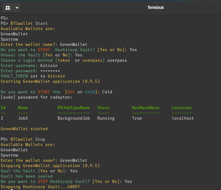 The PowerShell script, BTCwallet integrates with the VaultApi script and VeraCrypt to automate the starting and stopping of either the Green or Sparrow bitcoin wallet.
