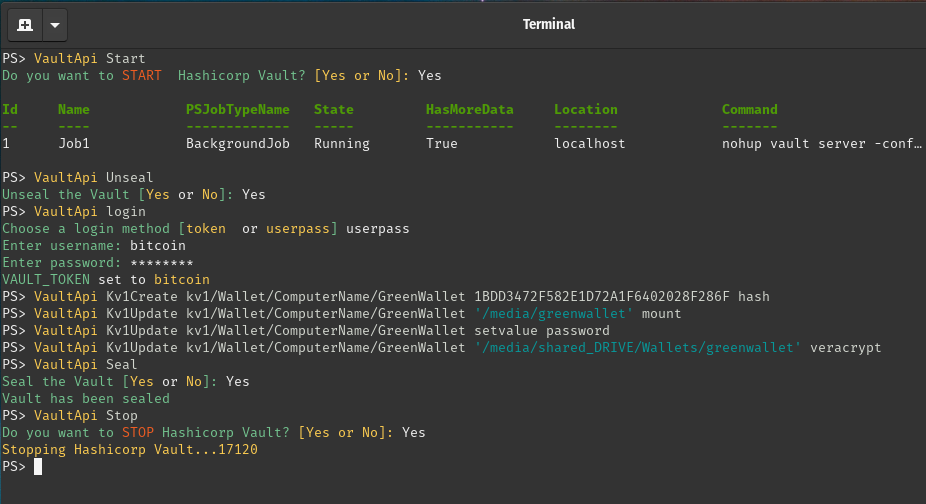 So you are likely wondering at this point, what in the hell has this to do with Bitcoin? The answer is with anything Bitcoin and related you need a secure way to store sensitive information. I've developed another PowerShell script called, BTCwallet which integrates with VeraCrypt , Hashicorp Vault , VaultApi for starting either Green or Sparrow wallet application using cold storage.